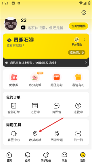 2、在個(gè)人中心的常用工具板塊,點(diǎn)擊【收貨地址】選項(xiàng)。