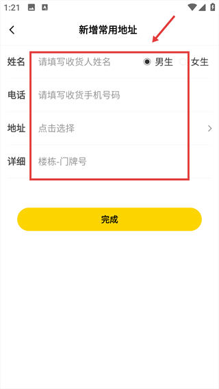 4、填寫【姓名】【電話】【地址】【詳細(xì)】等信息,完成后可點(diǎn)擊【完成】按鈕保存地址。