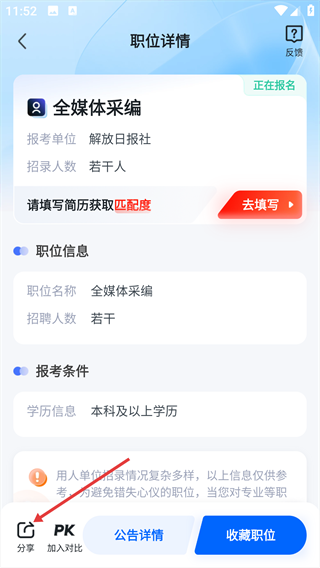 2、選擇目標職位,點擊進入該職位的詳情頁面。