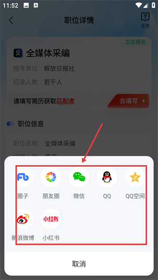 4、可選擇對應的平臺(如微信、QQ等),完成該職位信息的分享操作。
