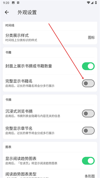 4、在外觀設置里找到完整顯示書籍名開關,點擊開啟該功能。