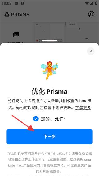 2、在彈出的“優化Prisma”提示框中勾選“是的,允許”,點擊【下一步】進入編輯界面。