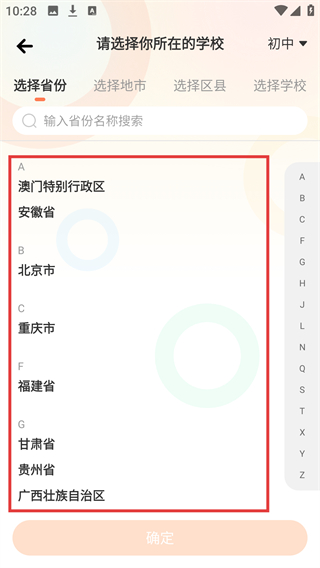 4、進(jìn)入【請選擇你所在的學(xué)校】界面,先選【省份】,再依次選地市、區(qū)縣、學(xué)校,也可搜索省份名稱快速查找。