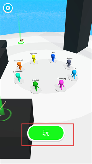 1、對戰(zhàn)準備界面呈現(xiàn)多個彩色小人角色,點擊【紅色框】內(nèi)綠色的【玩】按鈕,進入多人對戰(zhàn)核心場景。
