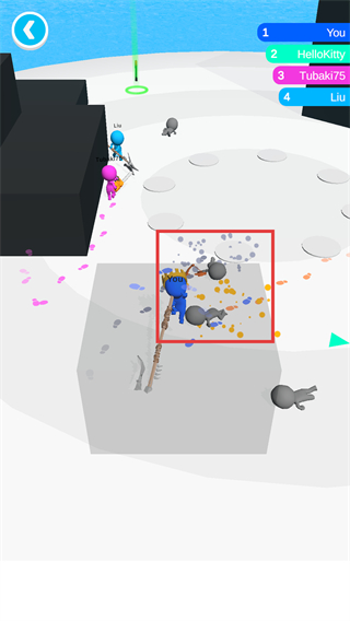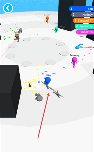 3、對戰(zhàn)過程中【紅色框】內(nèi)藍色小人借助武器特效攻擊周邊彩色小人對手。