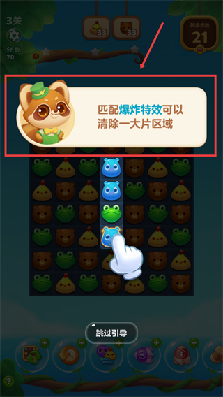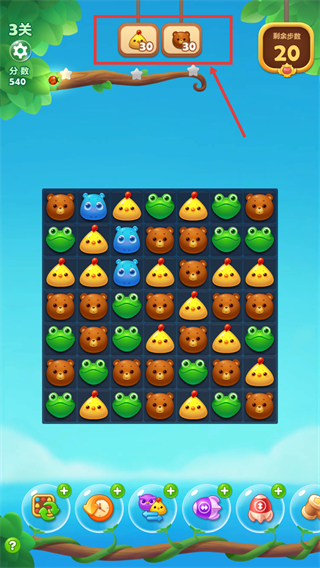 3、關(guān)卡目標(biāo)為收集指定數(shù)量的小雞和小熊,優(yōu)先消除對(duì)應(yīng)動(dòng)物并合理利用特效可快速達(dá)成目標(biāo)。