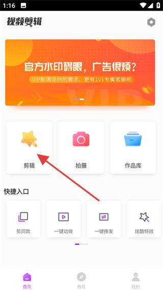 1、打開視頻剪輯大師,點(diǎn)擊首頁的【剪輯】選項(xiàng),進(jìn)入最近項(xiàng)目的視頻選擇界面。