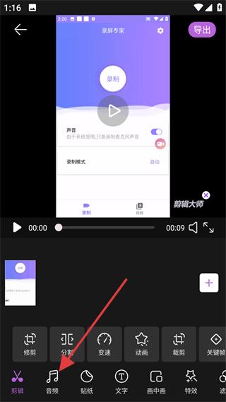 3、在編輯頁點(diǎn)擊底部的【音頻】選項(xiàng),展開配音相關(guān)功能(如音樂、音效)。