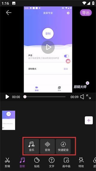 4、選擇【錄音】功能,長按錄制按鈕完成配音,調(diào)整音頻參數(shù)后點(diǎn)擊導(dǎo)出,即可完成視頻配音。