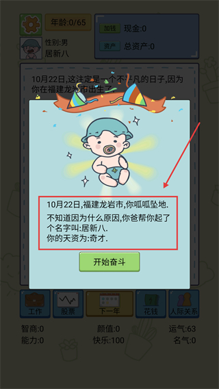 2、角色【居新八】在福建龍巖市出生,天資為【奇才】,點擊【開始奮斗】按鈕,開啟成長流程。