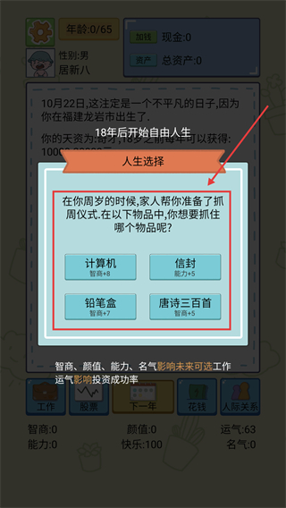 3、周歲抓周儀式中,可選擇【計算機】-【信封】-【鉛筆盒】-【唐詩三百首】,不同選擇影響初始屬性。