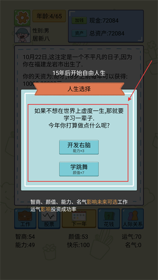 這是一個人生模擬游戲,在這里你可以選擇自己的生活方式,努力學習做個學霸,或是投入股市做個股壇奇才,又或是找份工作,和伴侶過平平淡淡的生活?