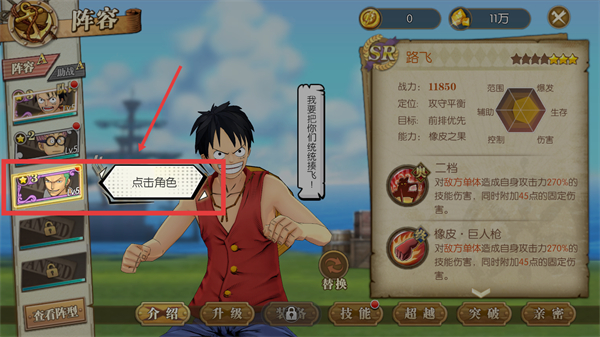 1、在陣容界面選擇【佐羅】,其定位攻守平衡,點擊角色卡片可配置至前排,提升隊伍攻防能力與爆發輸出。