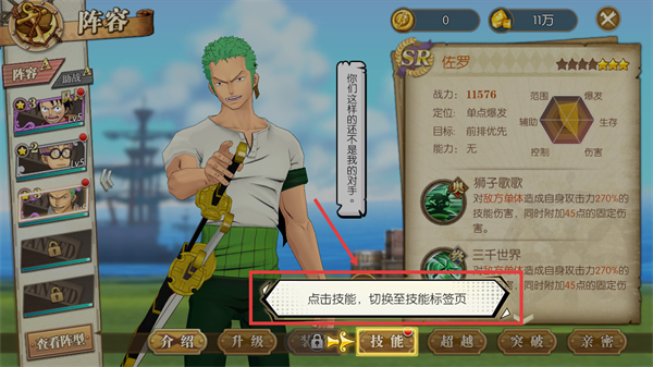 2、切換至【佐羅】的技能標簽頁,查看【獅子歌歌】-【三千世界】等技能,了解其單體爆發特性。