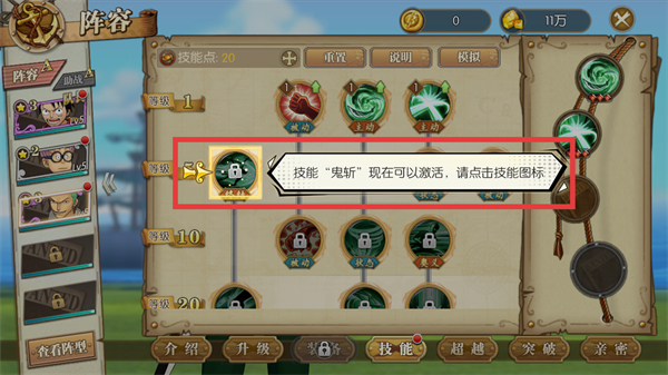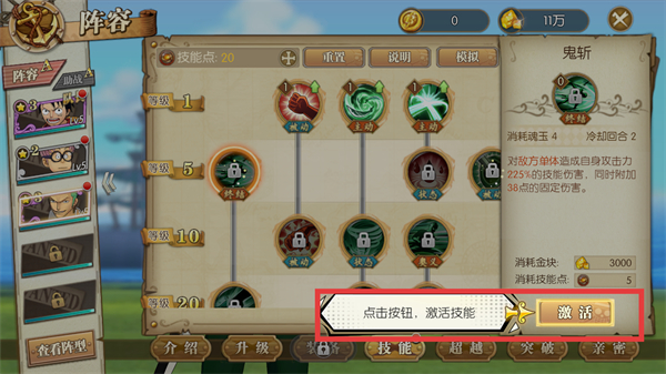 3、技能【鬼斬】已可激活,消耗技能點點擊圖標解鎖,能對敵方單體造成高額傷害增強輸出。