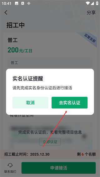 4、彈出【實名認證提醒】彈窗,選擇彈窗內的【去實名認證】按鈕,完成接活的前置要求。
