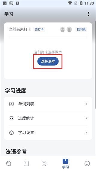 2、進(jìn)入學(xué)習(xí)頁面后,找到【選擇課本】按鈕并點(diǎn)擊。