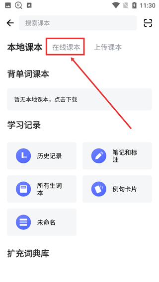3、進(jìn)入課本選擇頁面后,點(diǎn)擊【在線課本】標(biāo)簽,可切換到在線課本列表。