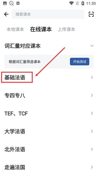 4、進(jìn)入【在線課本】頁面,找到【基礎(chǔ)法語】選項(xiàng)并點(diǎn)擊,該頁面還包含【專四專八】【TEF、TCF】等課本分類。