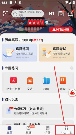 1、點(diǎn)擊底部導(dǎo)航欄的【個(gè)人中心】按鈕,從【真題】頁面跳轉(zhuǎn)至個(gè)人中心界面,可查看各類個(gè)人功能入口。