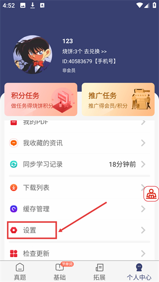 2、進(jìn)入【個(gè)人中心】頁面后,找到【設(shè)置】選項(xiàng)并點(diǎn)擊,即可進(jìn)入設(shè)置界面,查看各類配置選項(xiàng)。
