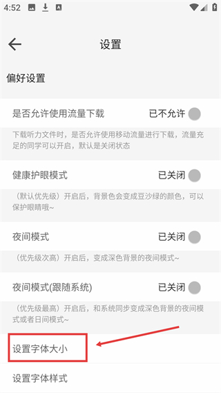 3、在【設(shè)置】頁面的【偏好設(shè)置】板塊,找到【設(shè)置字體大小】選項(xiàng)并點(diǎn)擊,進(jìn)入字體大小調(diào)整界面。