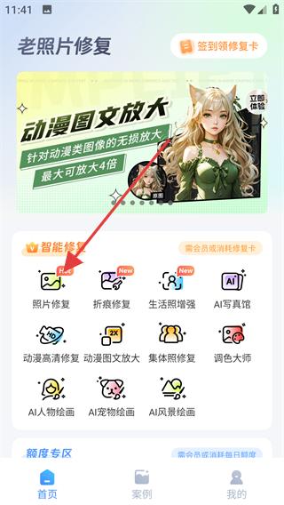 1、打開老照片修復工具,點擊【照片修復】選項,進入照片選擇的界面。
