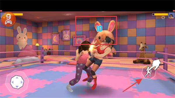 1、進(jìn)入比賽場(chǎng)景后,可點(diǎn)擊左側(cè)移動(dòng),或通過(guò)右側(cè)技能按鈕選擇摔跤動(dòng)作。