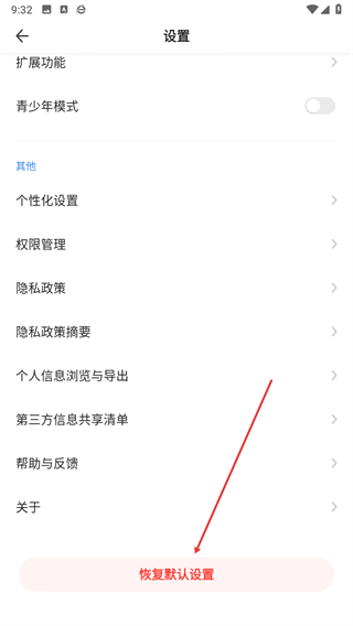 3、在設置界面底部找到恢復默認設置選項,點擊后彈出確認操作的彈窗。