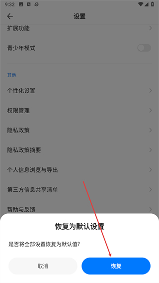 4、在恢復為默認設置的彈窗里,點擊恢復按鈕即可將所有設置還原為初始值。