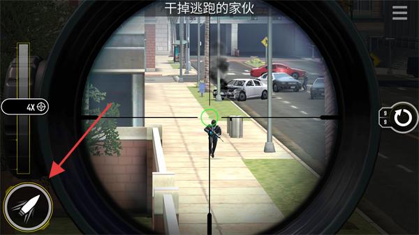 3、切換4X倍率放大瞄準鏡,精準定位穿黑衣的劫匪,避開周圍車輛與路人后進行射擊。
