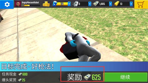4、成功擊倒目標后顯示“目標完成”,領取625現金獎勵(含25爆頭獎賞),點擊【繼續】進入下一個任務。