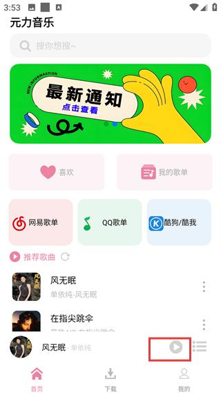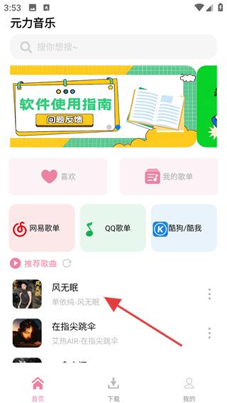 1、進入元力音樂首頁,可在推薦歌曲列表選擇想聽的音樂(如“風無眠”)。