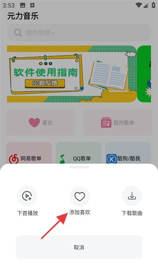 3、在操作菜單中,可選擇“添加喜歡”(將歌曲加入喜歡列表)、“下載歌曲”等功能。