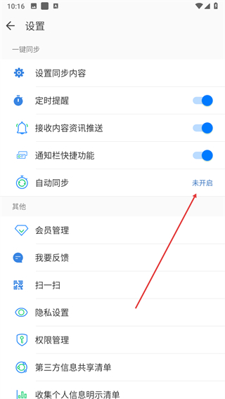 3、在設置界面一鍵同步分類下,找到自動同步選項并點擊進入對應頁面。