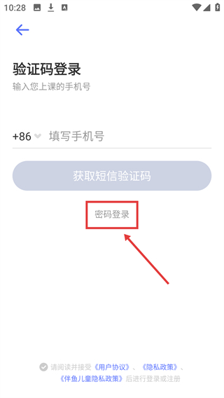 2、進(jìn)入登錄頁后,默認(rèn)是【驗(yàn)證碼登錄】模式,點(diǎn)擊【密碼登錄】選項(xiàng)可切換到對應(yīng)的登錄界面。
