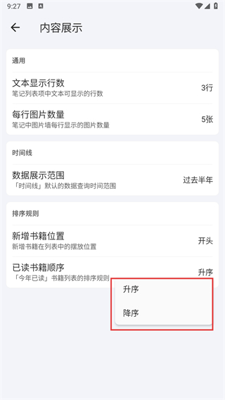 4、點擊已讀書籍順序選項,彈出選擇菜單后,挑選升序或降序完成設置。