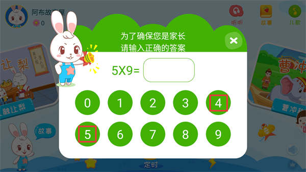 2、面對驗證界面時,先算出【5X9】的數值,再通過數字按鍵輸入答案,完成家長驗證步驟即可繼續操作。
