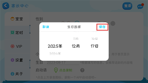 4、在【生日選擇】彈窗選定日期后,點擊界面右上角【保存】按鈕,就能完成寶寶生日信息的修改與確認。