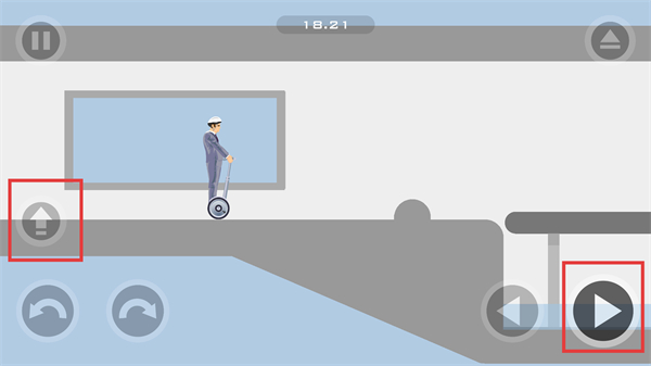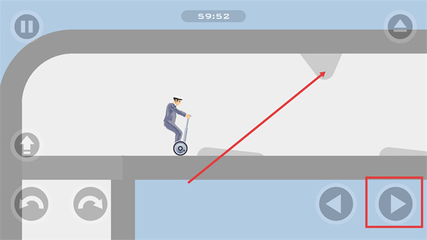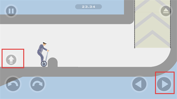 3、面對弧形路徑,持續(xù)點(diǎn)擊【向右按鈕】和【向上按鈕】讓角色沿曲線移動(dòng),注意平衡避免平衡車側(cè)翻影響進(jìn)度。
