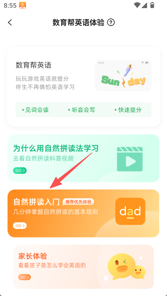 2、進入教育幫英語體驗頁,點擊自然拼讀入門。