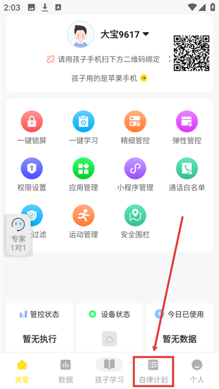 1、在【關愛】頁面點擊底部【自律計劃】入口,進入自律計劃界面。