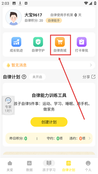 2、進入【自律計劃】頁面后,點擊【自律商城】選項,即可進入積分兌換獎品的可兌換界面。