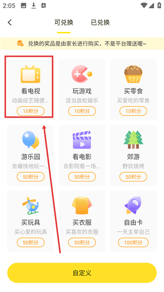 3、在【可兌換】頁面,選擇【看電視】獎品(需10積分),點擊即可進入該獎品的時長選擇界面。