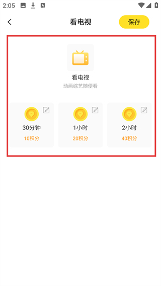 4、在【看電視】頁面,選擇對應時長(如30分鐘-10積分)后,點擊【保存】即可完成該獎品的兌換設置。