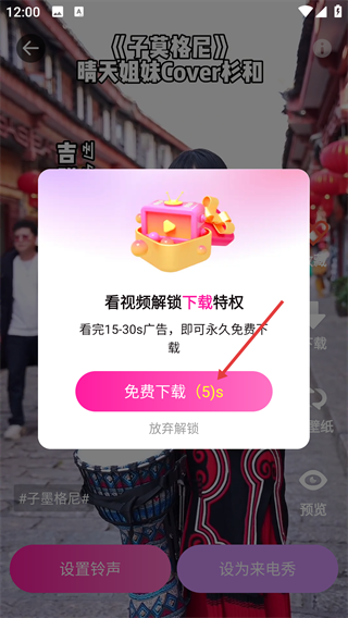 4、彈出“看視頻解鎖下載特權”彈窗,點擊【免費下載】按鈕,觀看廣告完成下載。