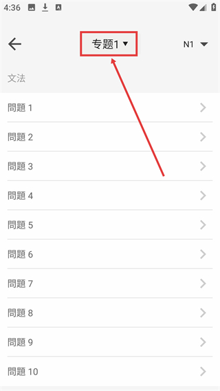 4、切換至【專題2】后,可看到對應的【文法】題目列表,包含問題1至問題10等練習內容,點擊對應題目即可開始練習。