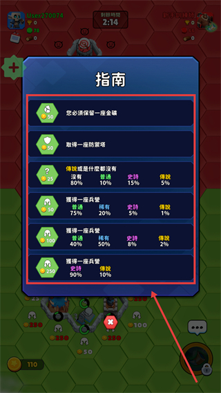 4、查看【指南】了解任務,如保留一座金礦、取得防禦塔,依機率獲取不同品質的兵營。