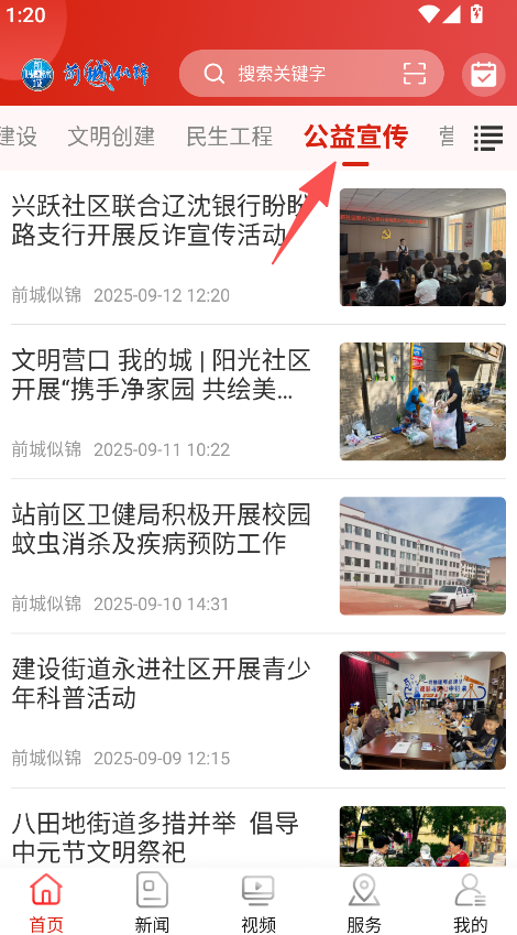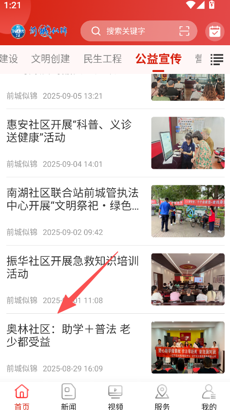 《前城似錦》是一款本地社區資訊類軟件,設搜索功能,分類含建設文明創建民生工程公益宣傳等板塊,展示社區開展的反詐宣傳凈家園等活動信息,含發布主體及時間,點擊活動可進入詳情頁查看完整內容,底部設首頁新聞視頻服務我的等入口,覆蓋資訊瀏覽及詳情查看環節,滿足本地社區信息獲取需求,助力及時了解社區相關動態。