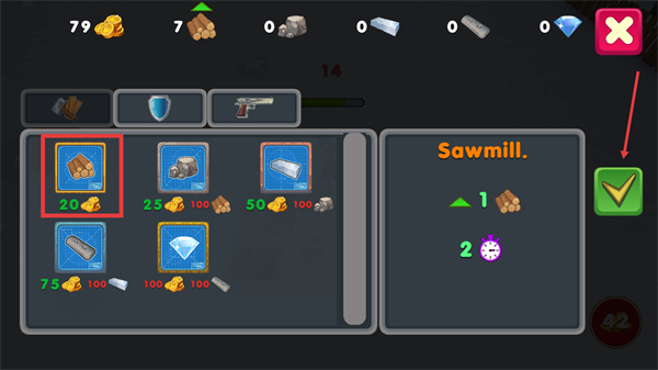 3、在建造界面,消耗金幣選擇木材道具,點擊右側按鈕解鎖建筑,用于生產資源。